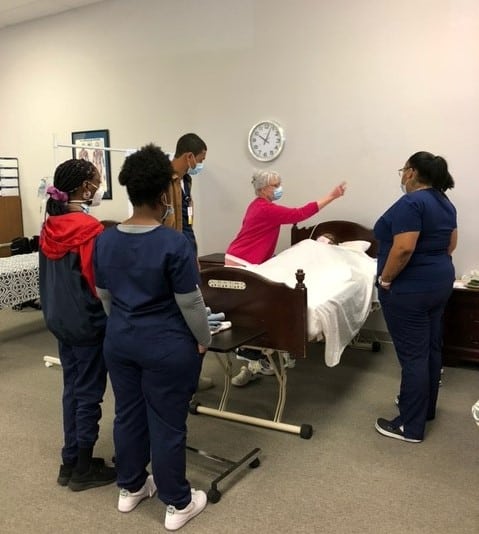 The apprenticeship class works on patient care, including how to change linens, with instructor Nora Gillespie.